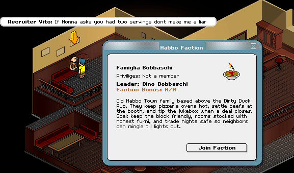 En una palabra: **no** ❌ Hemos visto especulaciones en Discord y X de que esto serían los Grupos de Habbo en Origins. Aunque en el futuro podríamos añadir Grupos, **Facciones es algo totalmente distinto**.